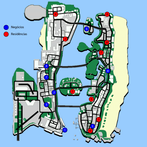 | Nesta imagem mostra as Casas que podem ser compradas no GTA Vice City Clique para ver a imagem |